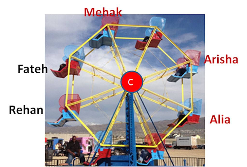 Maintenant, vous souvenez-vous à quoi ressemble une grande roue ? Je vais vous montrer une grande roue avec 8 gandoles où les enfants peuvent s’asseoir. Le centre de la roue est marqué de la lettre C. Il est relié par des rayons aux gandolas. Alia, Arisha, Mehak, Fateh et Rehan sont assis dans les gandolas comme indiqué. Tout d’abord, dites-moi quel est l’angle entre le rayon du bar à gandola d’Alia, au centre, et le rayon du bar à gandola d’Arisha. Je suppose qu’Alia et Arisha doivent comprendre ça.