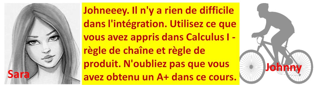 Johnny était heureux de pouvoir désormais résoudre des problèmes d’intégration simples. En fait, il était excité et a trouvé plusieurs problèmes en ligne et les a essayés. Certains d’entre eux étaient simples et il les passa en revue. Il y en avait d’autres avec qui il était coincé. Il en parlait à Sara car il savait qu’elle avait toujours deux longueurs d’avance sur lui.
