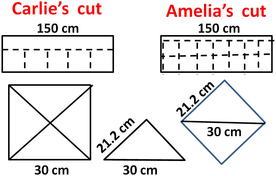 Amelia a montré une image qu’elle avait dessinée et a dit : Voici comment. Vos coupes sont à gauche. Chaque triangle que tu as fait avait une base de 30 cm et chacun des deux autres côtés mesurait 21,2 cm.