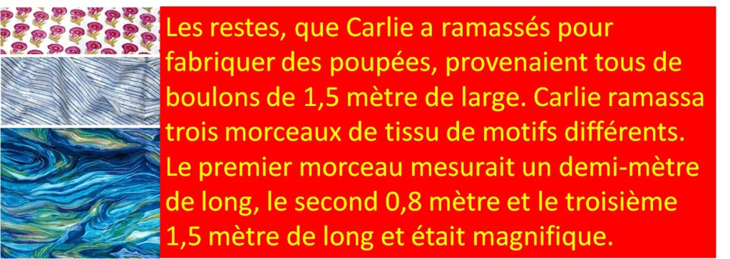 Carlie : Oui maman. J’ai l’argent que j’ai gagné avec le stand de limonade. Je veux aller dans un magasin de tissus pour obtenir un mètre de trois types de tissus différents et quelques autres choses.