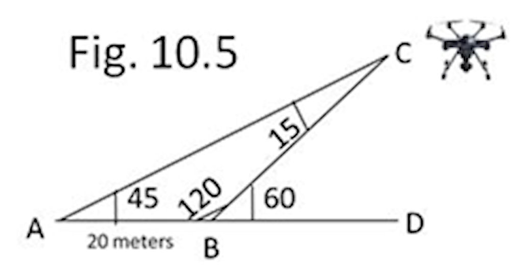 Soit : Distance AB = 20 mètres, angle CAB = 45°, angle CBD = 60° (notez que Sara devrait marcher plus loin vers le point D pour être sous le drone.