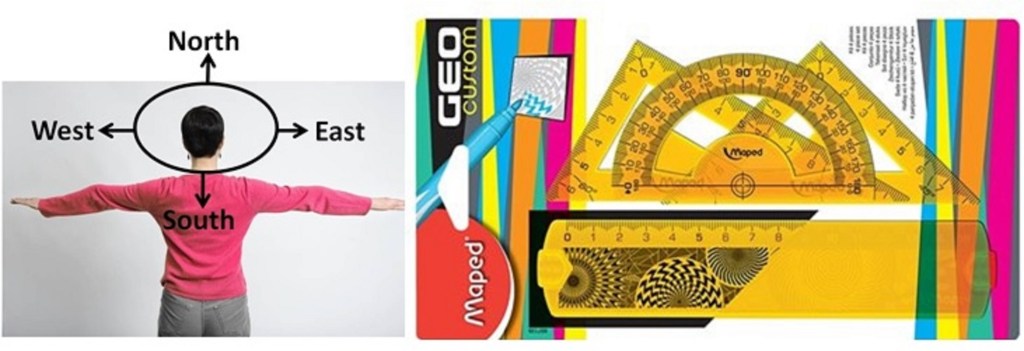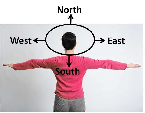 Farah stood in front of the class but Ms. Ali said: I am going to ask Farah to turn so that her right arm is towards East. In which direction does her left arm point ? (see the picture)