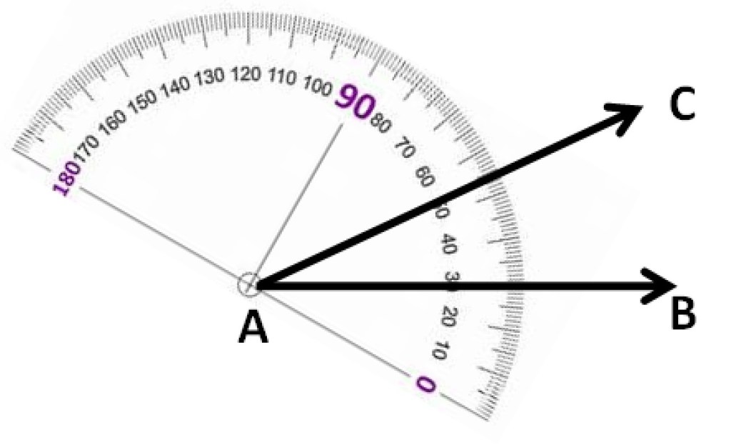 Let us say, you want to measure the angle BAC (see the picture below). Place the bottom line of the D on the line AB. In this picture the line AC crosses the D at 25⁰, So the angle BAC is 25⁰. You can measure any angle between 0 and 180⁰ with this instrument.