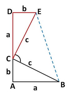 Because CDE and ABC are congruent Δs, CE = c and ∠ DCE = ∠ ABC. ∠ BCE = 180° – ∠ ACB – ∠ DCE (same as ABC) = 90°.