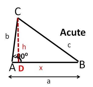Para un triángulo obtuso ABC, la longitud del lado BC opuesto al ángulo obtuso es c, la base AB es a y el lado AC es b. Dibujamos una línea vertical CD que llegaba a la base extendida AB en D. Sea h la longitud de BD y x sea AD.