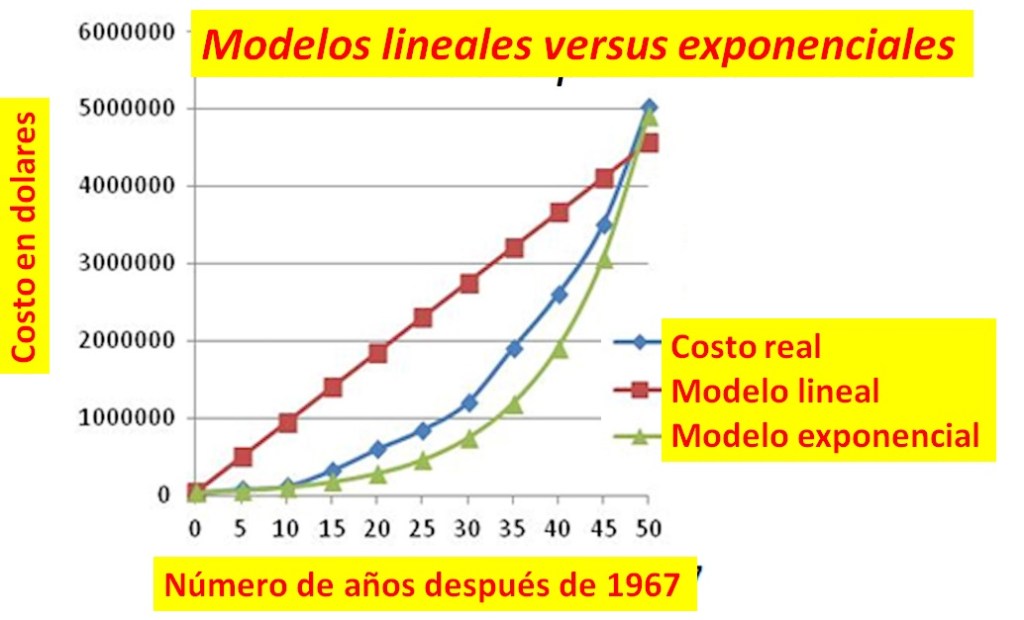 Solución: La imagen de la gráfica para modelos lineales y exponenciales muestra que el modelo exponencial explica mejor el aumento en el costo.