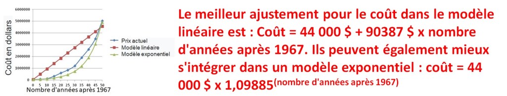 Coût = 44 000 $ x 1,09885(nombre d’années après 1967). Cela correspondait à une augmentation moyenne de 9,885 % par rapport à l’année précédente. Sur le même graphique, tracez les coûts basés sur des modèles linéaires et exponentiels donnés dans le tableau. Quel modèle pensez-vous est le meilleur?