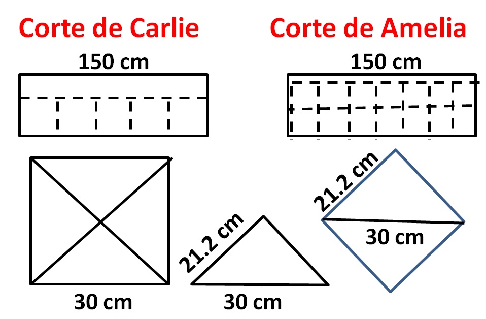 Amelia mostró un dibujo que había hecho y dijo: Así es como. Sus cortes están a la izquierda. Cada triángulo que hiciste tenía una base de 30 cm y cada uno de los otros dos lados tenía 21,2 cm.