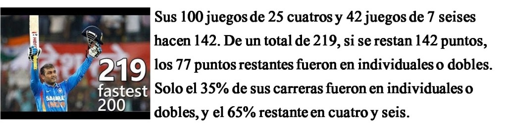 Tinku: Sabes que golpeó 25 límites para obtener 100 carreras, y los 7 seises para 42. Sus cuatros y seises suman 142 y sus sencillos y dobles son solo 77 (219 menos 142). Eso significa que solo el 35% de sus carreras son en individuales y dobles, y el 65% de ellas en fours y sixes. Desearía poder hacer eso.