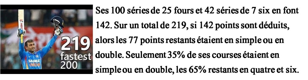 Tinku : Vous savez qu’il a atteint 25 limites pour obtenir 100 points, et les 7 six pour 42. Ses quatre et six totalisent 142 et ses simples et doubles ne sont que de 77 (219 moins 142). Cela signifie que seulement 35% de ses courses sont en simple et en double, et 65% d’entre elles sont en quatre et six. J’aimerais pouvoir faire cela.